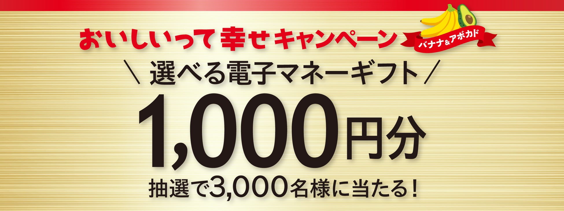 「おいしいって幸せ」バナナと、ファーマインドロゴが付いたアボカド全品を対象に、商品をご購入いただいた方の中から、抽選で3,000名様に【選べる電子マネーギフト1,000円分】が当たります。