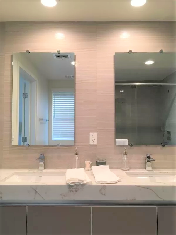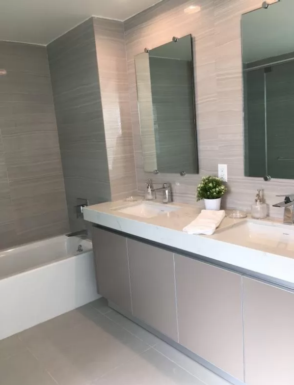 新築のため、リビングやキッチン、バスルームなどはとても綺麗で清潔感があるとともに、アメリカでは大変珍しく、バスタブつきのバスルームを各部屋に備えています。洗濯乾燥機やエアコン、バルコニー、テレビ、Wifiなども完備しているので、長期の滞在も快適に過ごすことができます。