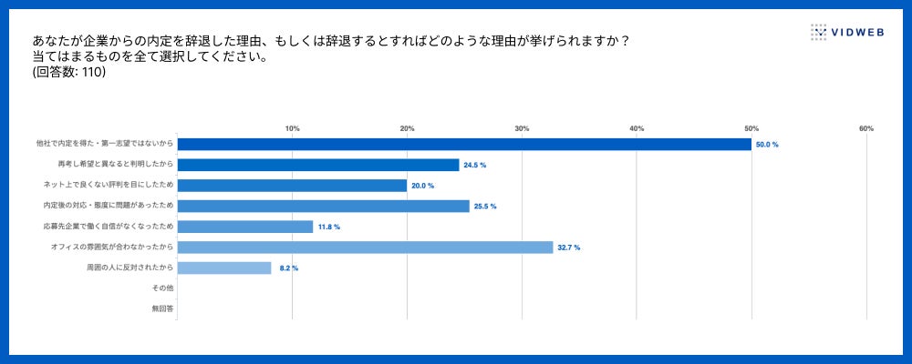 内定辞退の理由として「他社内定」や「希望と異なると再考した」が多くを占める一方、内定後の企業対応やオフィスの雰囲気も辞退を決断する重要な要因となっていることがわかります。