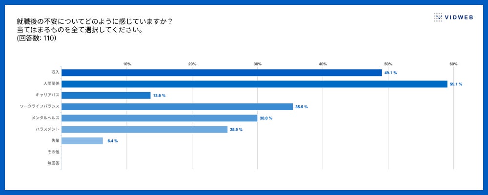 就職後の不安として最も多く挙げられているのは「人間関係」であり、「ワークライフバランス」や「メンタルヘルス」への懸念も高く、職場環境や働き方への不安が大きな割合を占めていることがわかります。