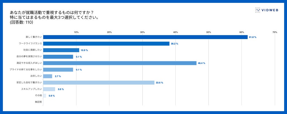株式会社VIDWEBでは、Z世代の就活意識・動画利用状況の調査を目的としてオンラインアンケートを実施しました。採用活動や採用動画の企画・制作にお役立てください。調査結果から、Z世代の就職活動においては楽しく働ける職場や仕事のやりがいが重視され、情報収集には動画やSNSといったビジュアルコンテンツの活用が進んでいることがわかりました。