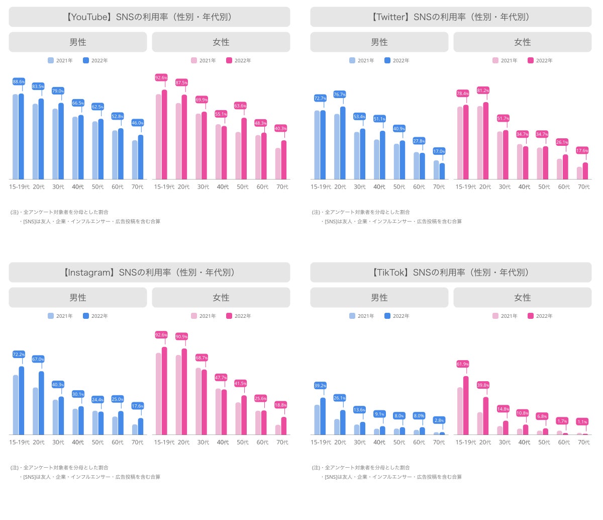 利用率が大幅に上昇した「YouTube」は、20代・30代男性と、15-29歳、20代、50代の女性の利用率が大幅に上昇し牽引しました。「Instagram」は、50代男性、30代、40代女性が若干下がったものの他は上昇しています。「TikTok」は、50代までの全ての年代で利用率が上昇しました。
