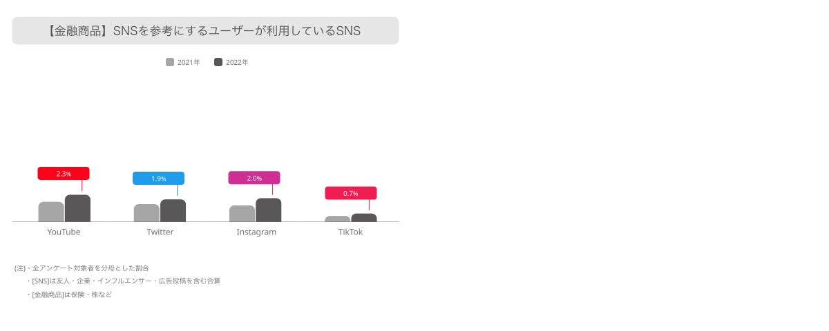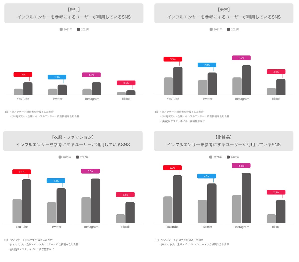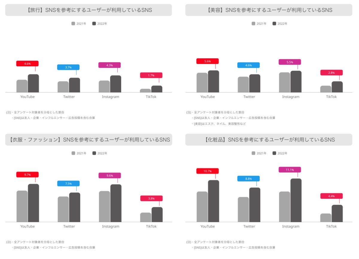 インフルエンサーを参考にするユーザーが、利用している「YouTube」、「Twitter」、「Instagram」、「TikTok」の割合を「旅行」、「美容」、「衣服・ファッション」、「化粧品」、「金融商品」の主要商品カテゴリーごとに見ると、2021年と比較し2022年はすべてにおいて利用が伸びています。