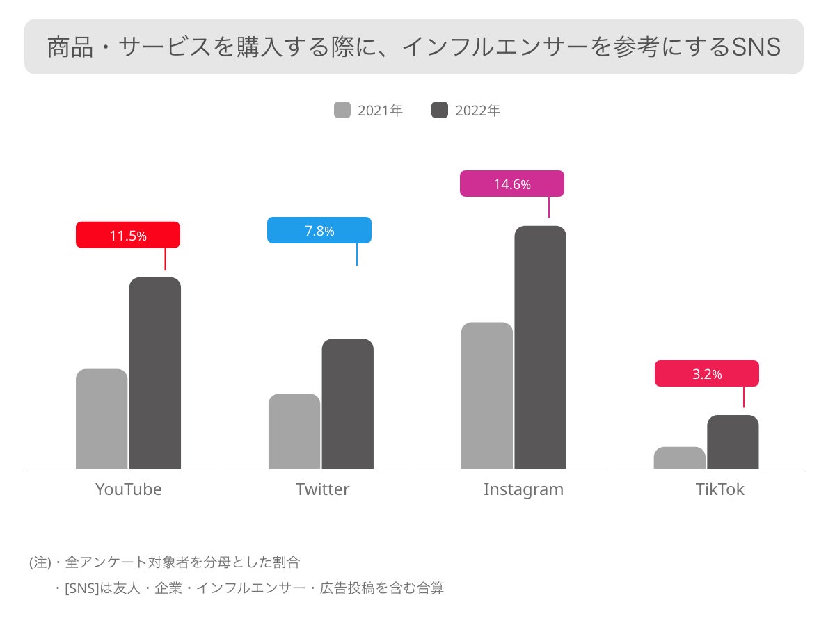商品・サービスを購入する際に、インフルエンサーを参考にするSNSは「Instagram」が最も高く、「YouTube」、「Twitter」と続いており、いずれのSNSも2021年より大幅に上昇しています。