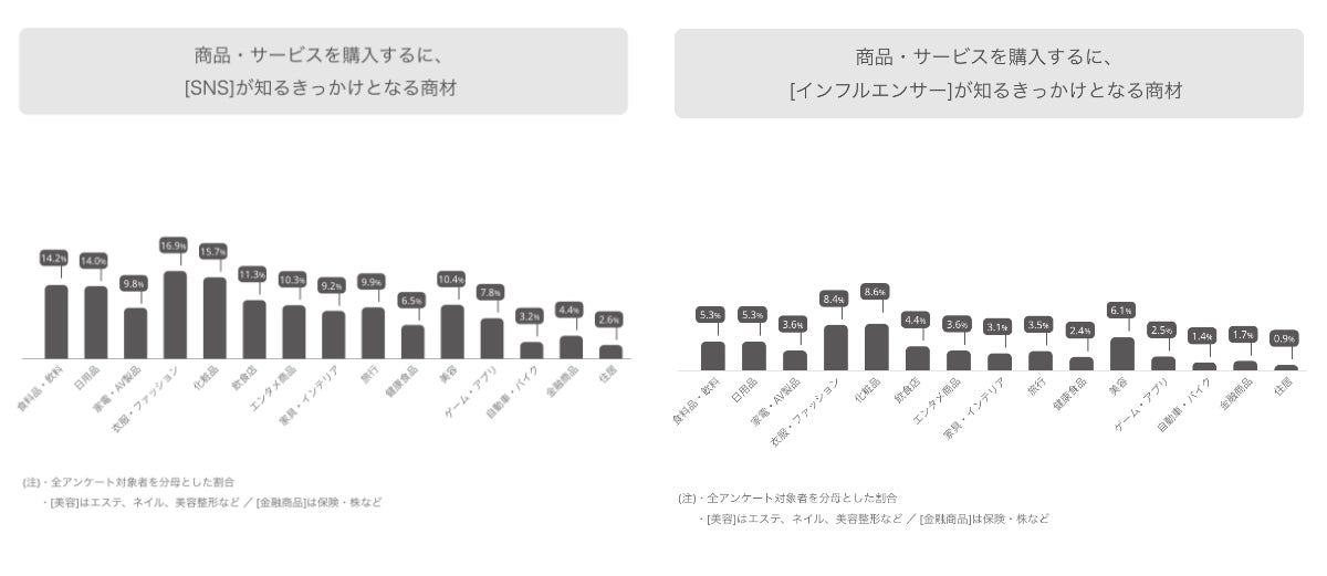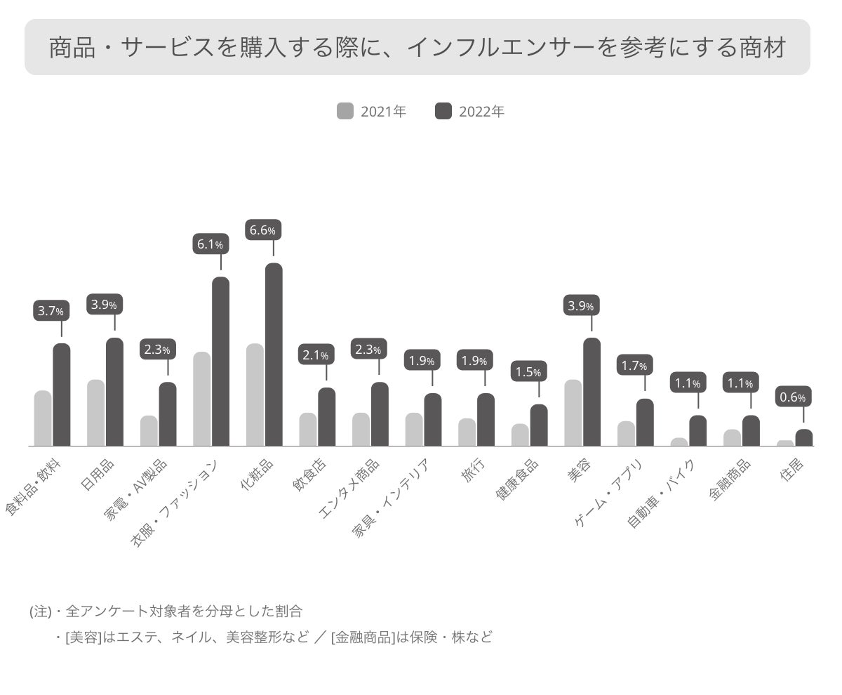 商品・サービスを購入する際にインフルエンサーを参考にする率は、2021年と比較し全ての商材で上昇しました。商材別の比較では、2021年に高かった「衣服・ファッション」、「化粧品」が引き続き高く、次いで「美容」と、昨年同様になっています。