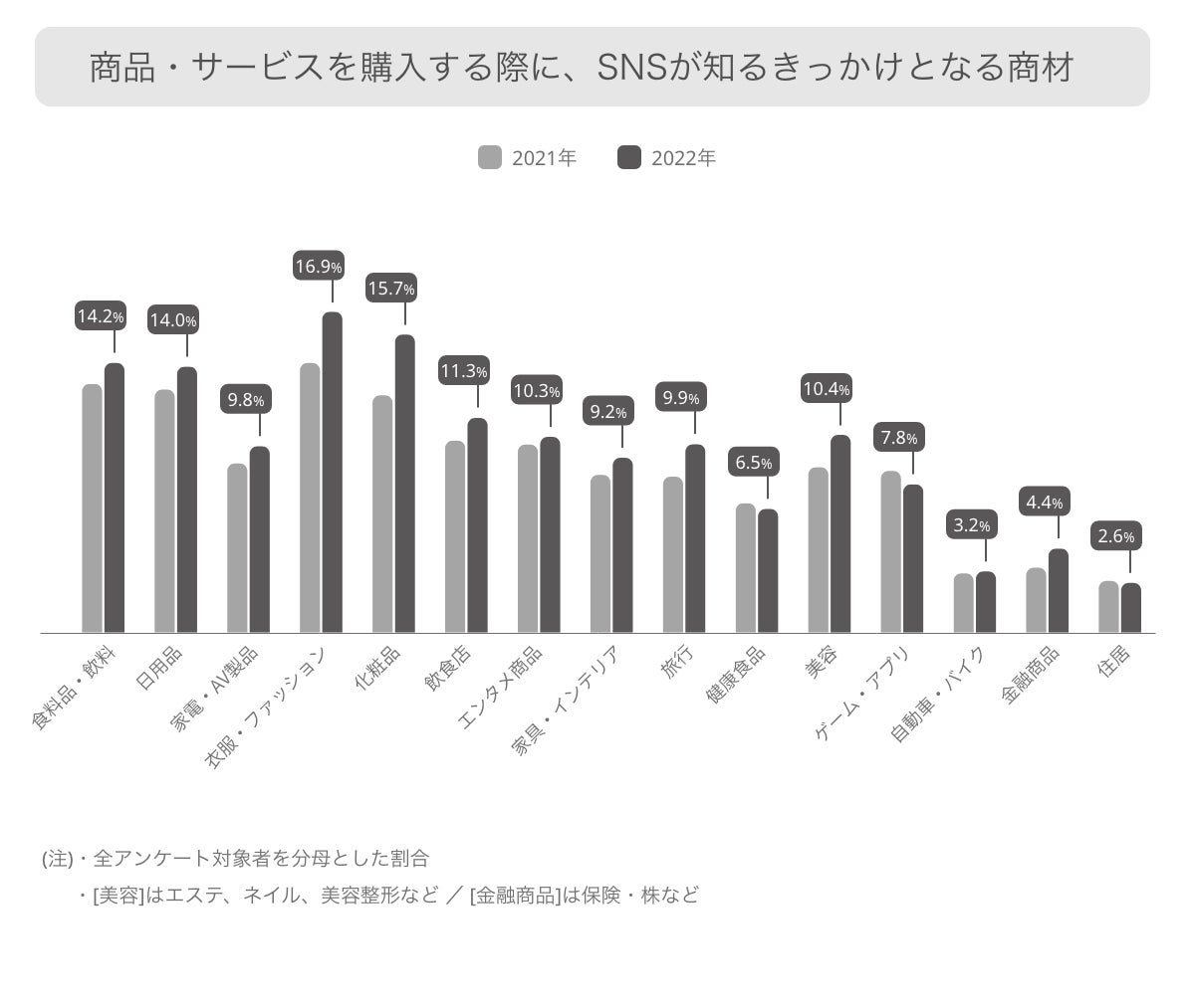 2021年に引き続き、2022年もSNSが知るきっかけとする商材は、「衣服・ファッション」が最も高くなっています。伸び率では「化粧品」が12.5%から15.7%に最も伸び、「旅行」、「衣服・ファッション」、「美容」、「金融商品」も伸びました。