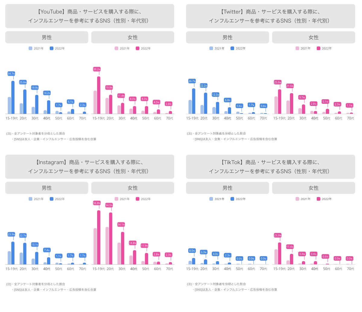 性別・年代別にみると、若年層ほどインフルエンサーを参考にする率が高い傾向となっています。また、2021年と比較すると、一部を除きSNSは年代に関わらず上昇しています。