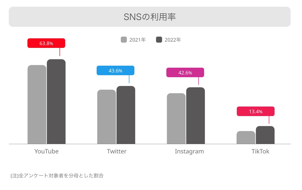 商品を買う際に知る、参考にする、後押しとなる際に、利用しているSNSを「YouTube」、「Twitter」、「Instagram」、「TikTok」で比較した結果、2021年に引き続き「YouTube」の利用率が高くなっています。