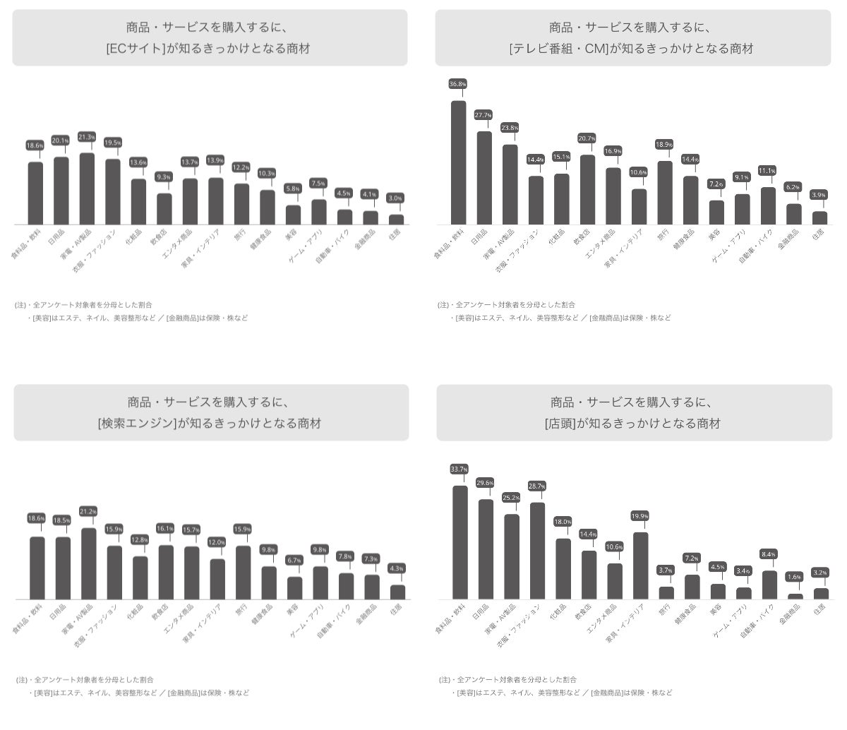 「テレビ番組・CM」では、「食料品・飲料」や「日用品」など日用消費財が知るきっかけとなる情報源率が高くなっています。「ECサイト」や「検索エンジン」では、「家電製品」などの型番商品が知るきっかけとなる情報源率が高く、情報源により傾向が異なります。