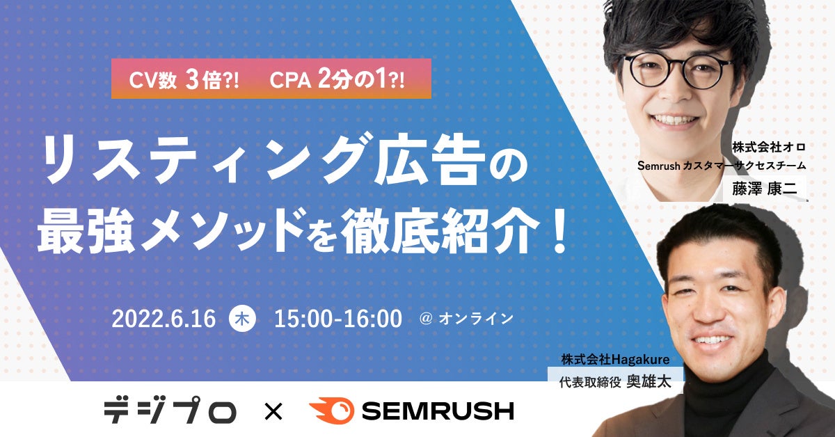 国内最大(※)のWebマーケティングスクール「デジプロ」を運営する株式会社Hagakure(本社:東京都渋谷区、代表取締役:奥 雄太)は、オールインワン競合分析ツール「Semrush」を提供する株式会社オロ(本社:東京都目黒区 代表取締役:川田 篤)と共催で、リスティング広告の効果的なノウハウをお伝えする無料オンラインセミナーを開催します。