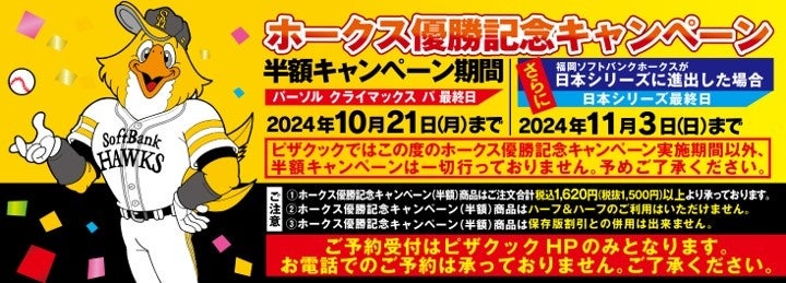 ホークス優勝記念、ピザMサイズ全品半額キャンペーンは、ホークスリーグ優勝の瞬間からスタート!半額ピザがデリバリーで注文できるのは本キャンペーンだけ!