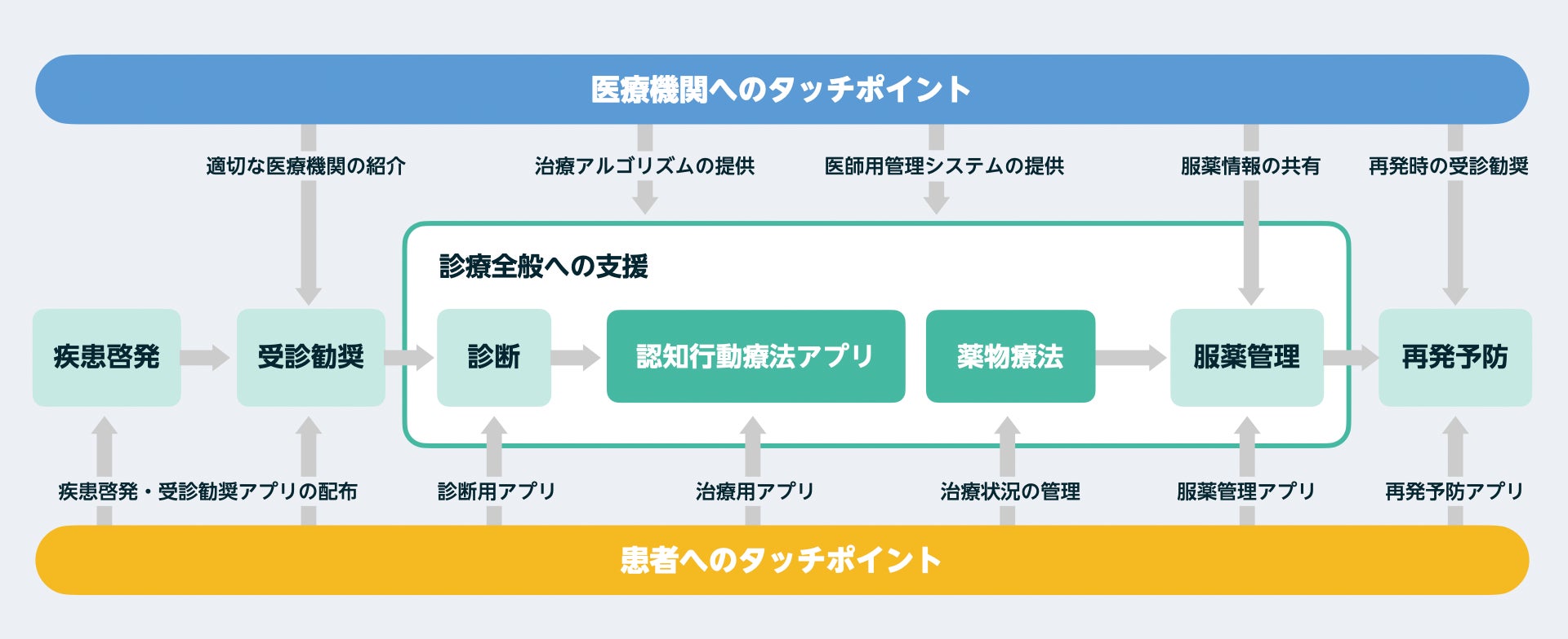 各疾患ごとの啓発・受診勧奨アプリを全国に展開することで、治療が必要な方への啓発を行います。そして、適切な医療につながった後は良質な診療を受けられるべく、デジタルサービスやSaMD(Softwere as Medical Device)を活用した診断・治療の支援を行います。治療終了後は再発予防アプリにてQoLの維持までをサポートします。