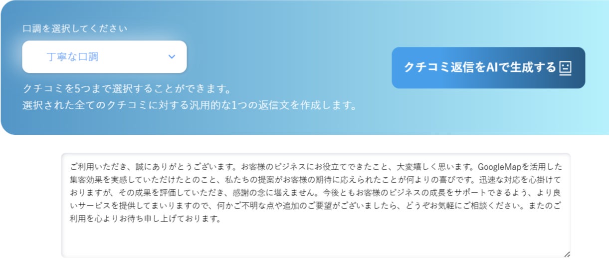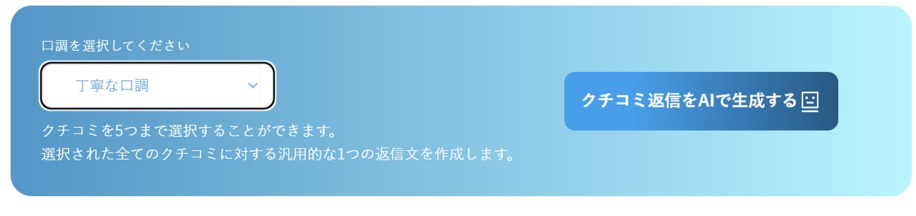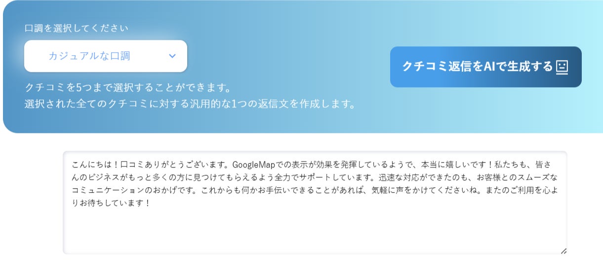 「返信が大変」「ネガティブな口コミが辛い」などの現場の悩みに応え、感謝の伝わる返信をAIがサポート。「丁寧」「カジュアル」など口調も選べます。