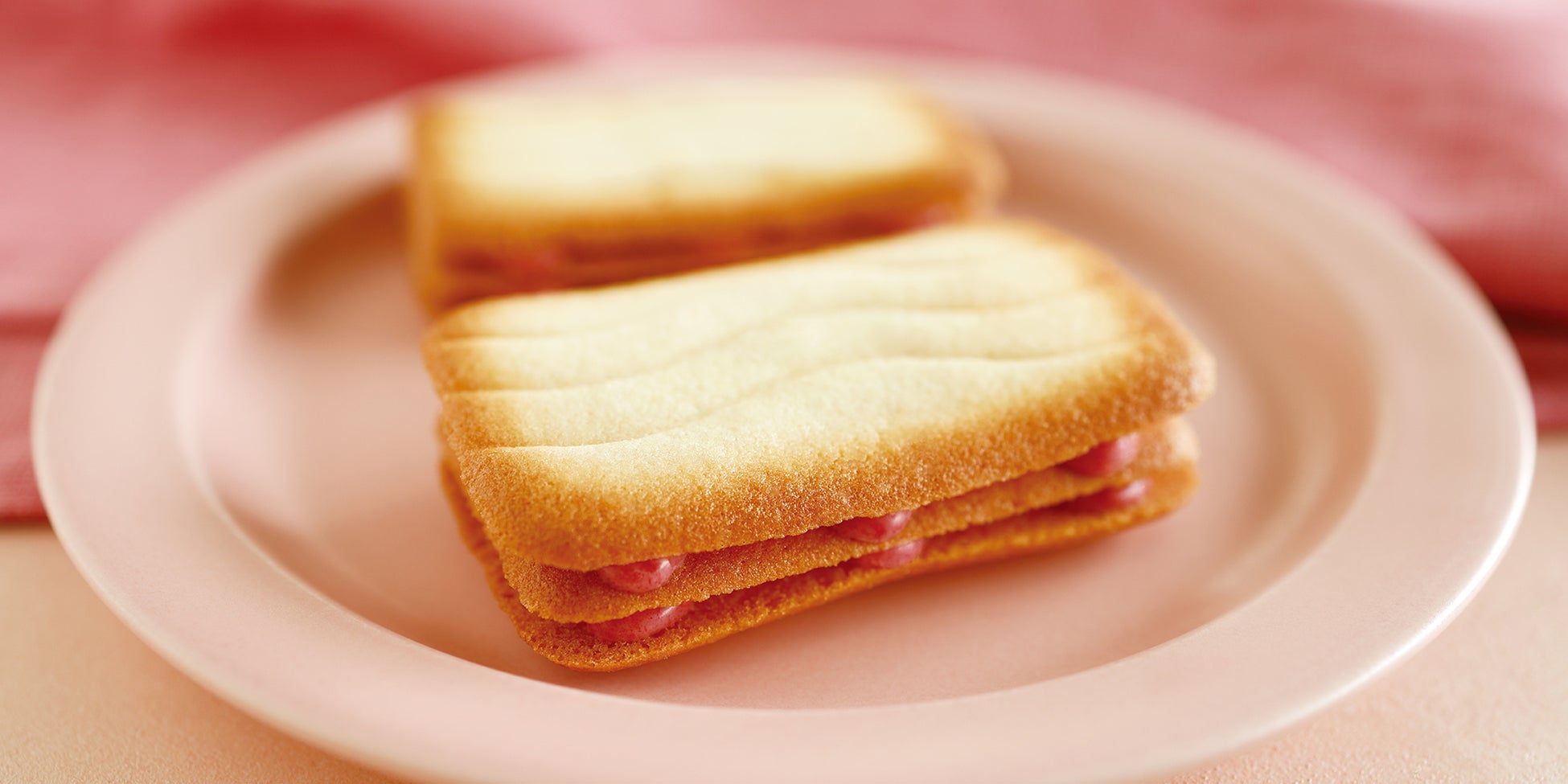 『東京カンパネラ FRAGOLA※ 』のラングドシャは、繊細なタッチの味わいに仕上げるためにあえてプレーン味を使用し、間にはさまれたストロベリーチョコレートの風味がより一層引き立つようにしました。