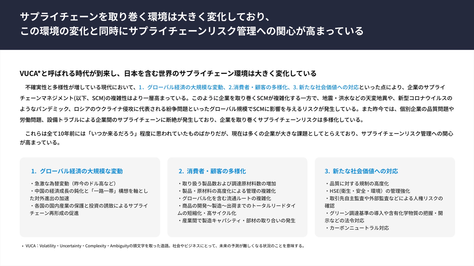 VUCAと呼ばれる時代が到来し、日本を含む世界のサプライチェーン環境は大きく変化している。グローバル経済の大規模な変動、消費者・顧客の多様化、新たな社会価値への対応といった点で企業のサプライチェーンマネジメントの複雑性はより一層高まりまた、地震・洪水などの天変地異や、新型コロナウイルスのようなパンデミックの発生など企業を取り巻くサプライチェーンリスクは多様化している。このように複雑化している環境下において企業が安定供給を実現するためには、予期せぬ事象に備え、混乱に対応することで、事業継続性の維持と回復に適応する、レジリエントサプライチェーンの実現が重要となる。