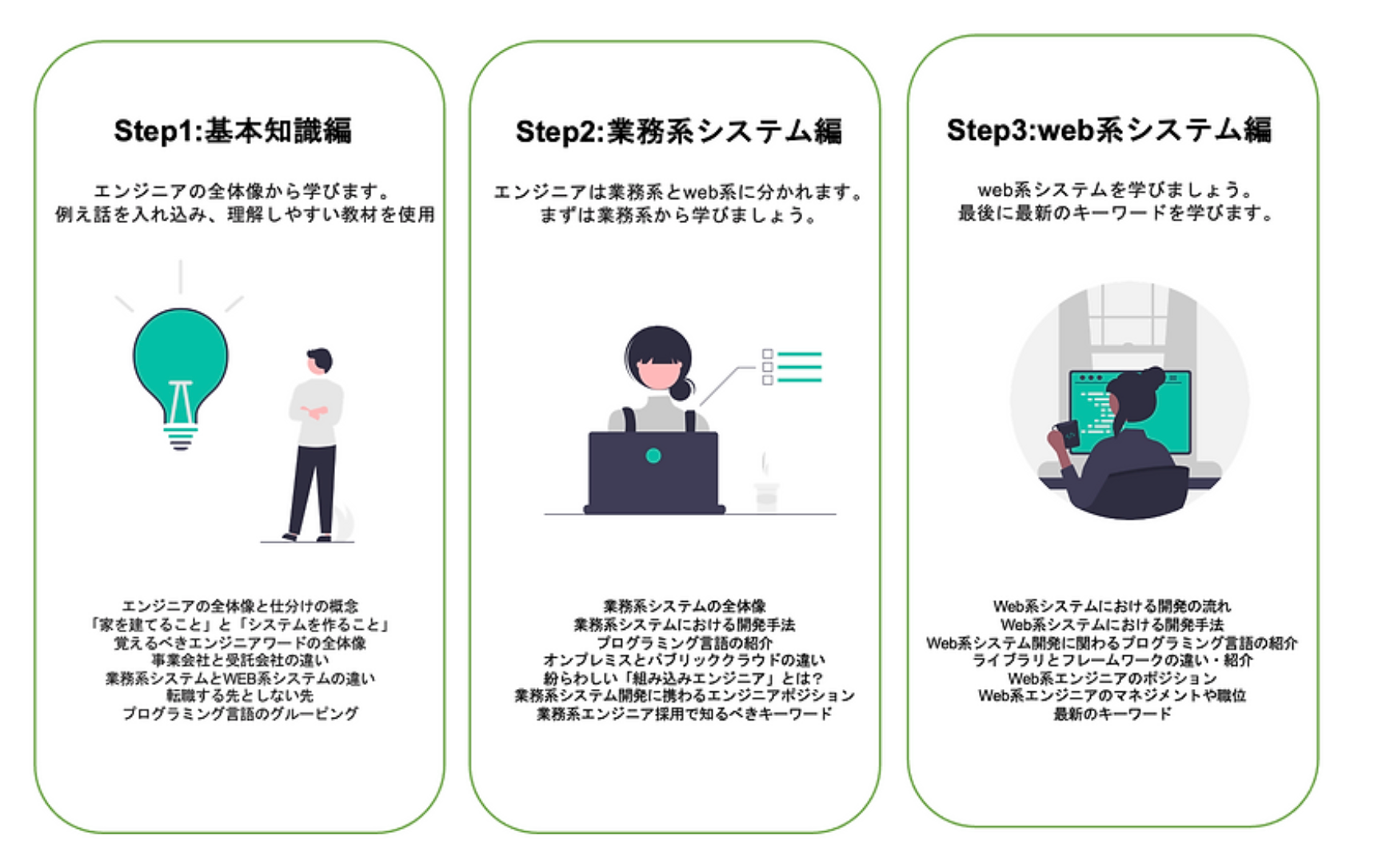 オリジナル教材を用いて、エンジニア採用初心者にもわかりやすいレッスン内容になっています。