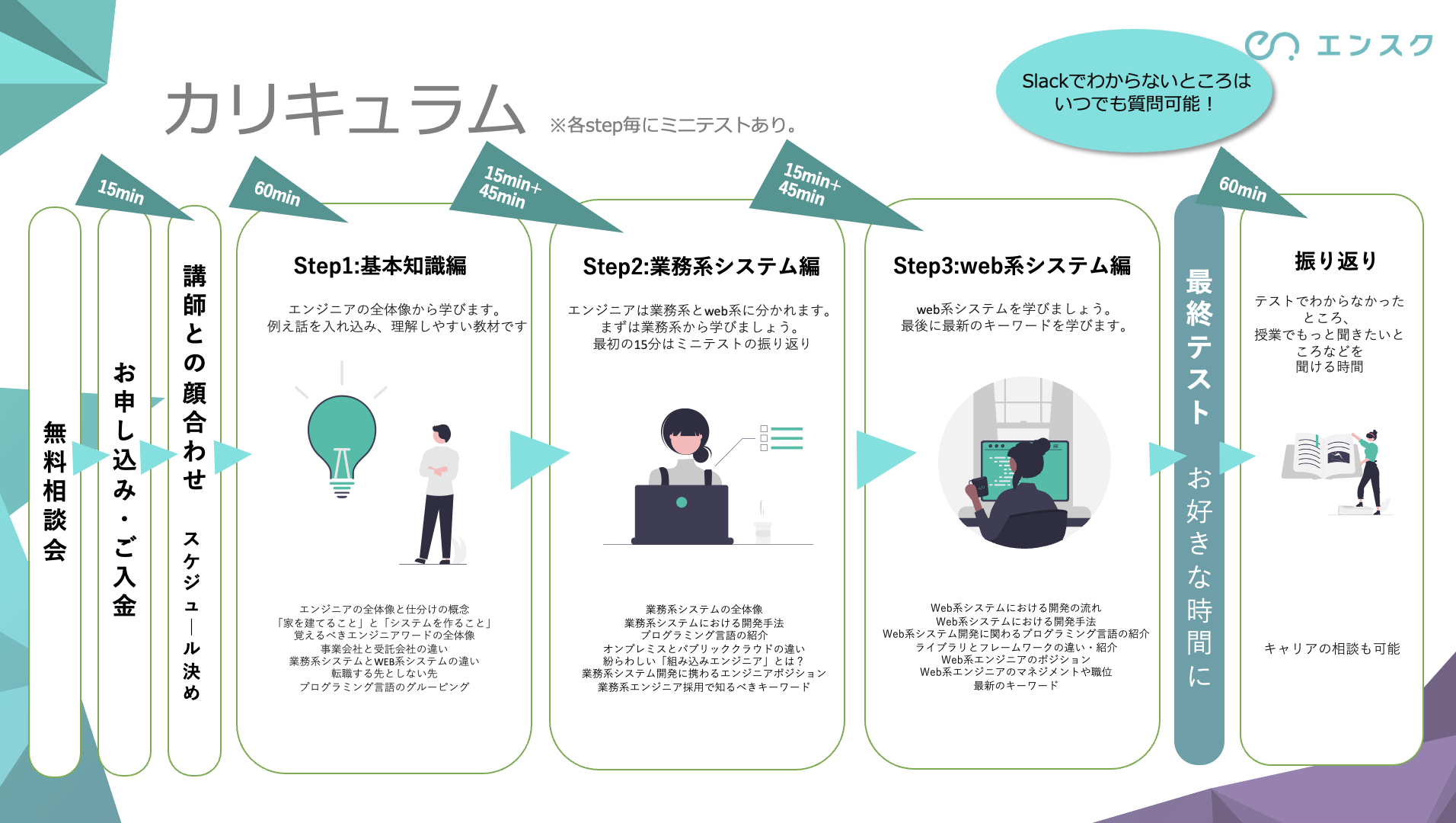 そこで、これまで大手やメガベンチャーのITエンジニア採用の支援を行ってきた当社が、エンジニア採用のプロからレッスンを受けられる「エンスク」を開講することにしました。