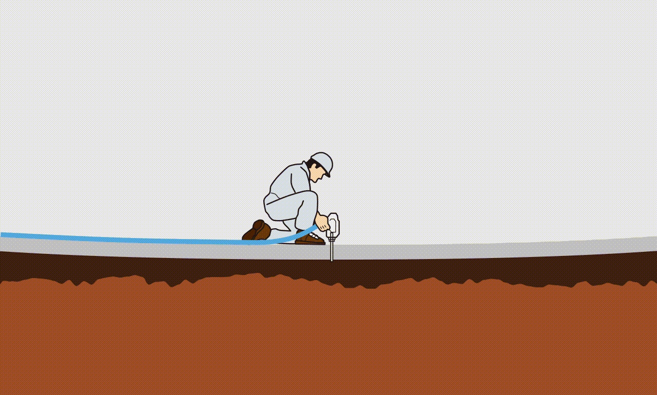 硬質ウレタン「テラテック樹脂」をコンクリート土間床下に注入し、その膨張力で床下の空洞を埋め、沈下した土間床を持ち上げて修正する特許工法です。
