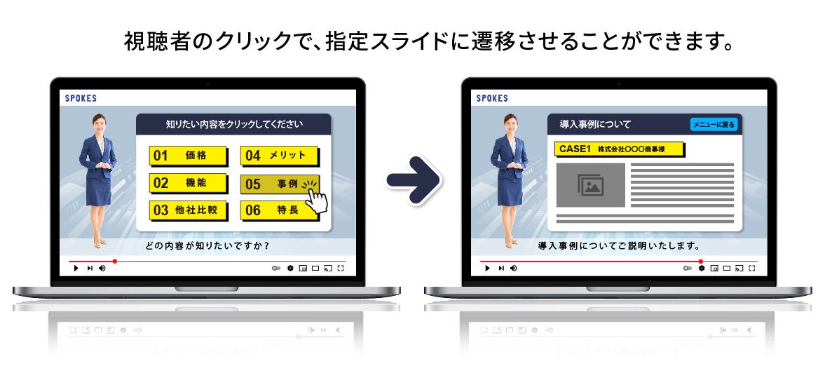 PowerPointのリンク機能を使うことで、動画内に「クリック可能な選択肢(リンクボタン)」を用意でき、動画を分岐させることが可能です。これにより、視聴者が聞きたい項目を選択し、選択した内容だけをSPOKESが説明(再生)する、といった視聴者参加型の動画を作れます。リンク先を、お申込みフォームやアンケート画面に設定して遷移させたり、「オペレーターへ繋ぐ」といった有人対応への導線にすることもできるため、動画をプラットフォームとした各種誘導を行うことも可能です。
