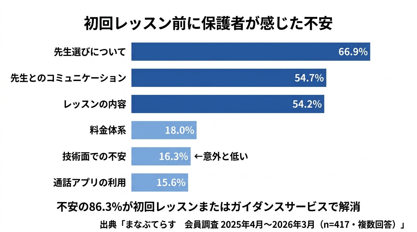 また、初回レッスン前の不安として「技術面」を挙げた家庭が16.3%にとどまったことは、オンラインで学ぶこと自体は多くの家庭にとってすでに特別なものではなくなっていることを示している。利用にあたって家庭が重視するのは、機材や回線ではなく「どの先生に教わるか」へと移っている。