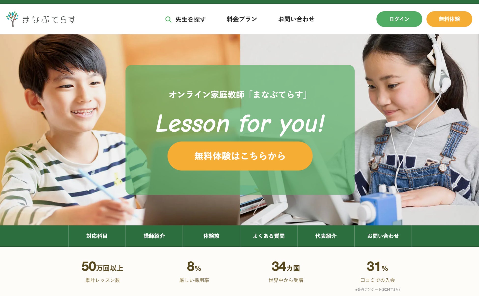 2016年にサービスを開始したオンライン家庭教師サービス。「すべての子どもが『自分の強み』を持てる社会をつくること」をミッションに掲げ、子ども一人ひとりの目標や個性に合わせたオーダーメイドレッスンを提供している。採用率8%の選考を通過した200名以上のプロ講師が在籍し、勉強(中学受験・高校受験・大学受験・英検対策など)から習い事(そろばん・ピアノ・プログラミング・アートなど20種類以上)まで、1つのアカウントでマンツーマンの個別指導を受けられるのが特徴。現在、日本に加え、海外34カ国のご家庭に利用されている。
