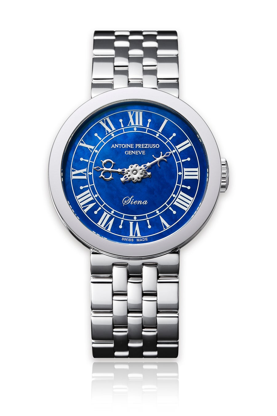 天才時計師と称されるプレジウソの拘りのディテールが「シエナ」の随所に光ります。バロック様式のレース状の時針と分針が映えるシエナの青空をイメージしたブルーのマザー・オブ・パールダイヤル。又、丁寧に仕上げられた「PREZIUSO」のロゴをあしらったニューローターにより裏面からの美観も備えています。ラグのない真円のケースは時計塔のデザインが忠実に再現されています。