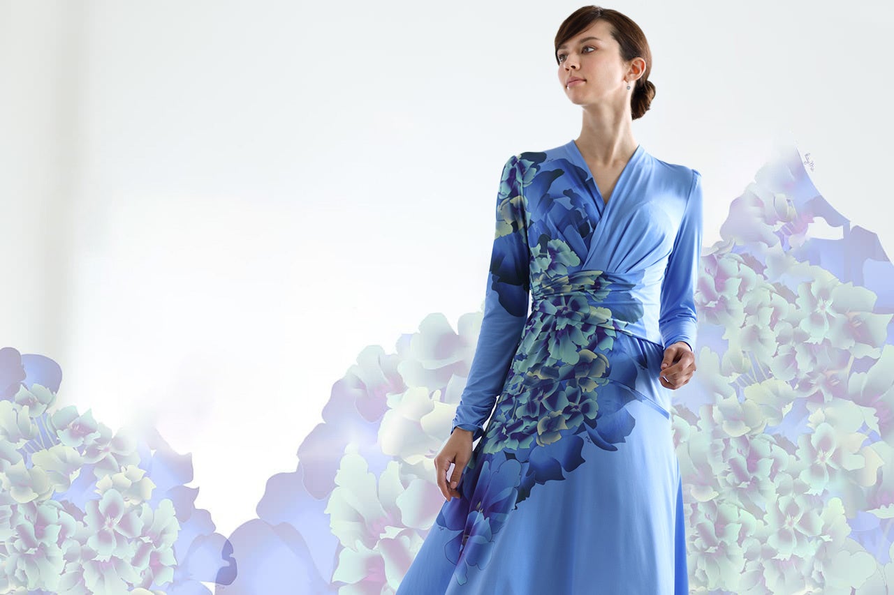 kay meのワンピースは、ひとつひとつのパターンを出来るだけ小さく分け、ギャザーやドレープを多用し、身体を美しく見せることにこだわっています。今季、忘れられないプリント「第1位」に輝いたプリントが10年越しに復刻し、kay me の真骨頂ドレスが登場します。リードデザイナー毛見の呉服屋を営んだ祖母へオマージュし、英国トップのデザイナーが描く花束を「和」の世界観に落とし込みました。「柄取り」という高難度の技術が詰め込まれた特別な1枚です。
