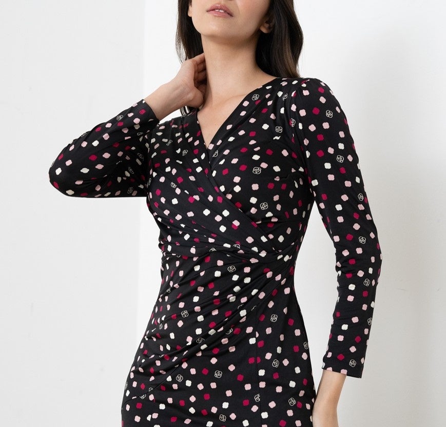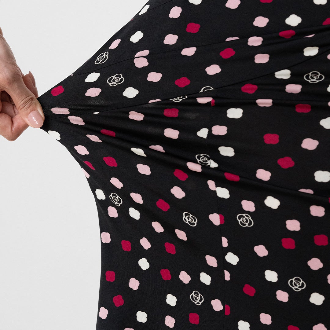 ブランドアイコン「kay meローズ」をプリントした、デイリーユースのドットプリントが新登場!グラマラスなマーメイドラインのフィット&フレアが美しい、褒められワンピースです。ブラックベースの小柄だから毎日着られること間違いなし。そこにいくつかのピンクをアクセントにしてラブリーさをプラス。同プリントシリーズには、優しいボートネックの「デイリーワンピース」や大人エレガントな「ロングワンピース」などもラインナップ。