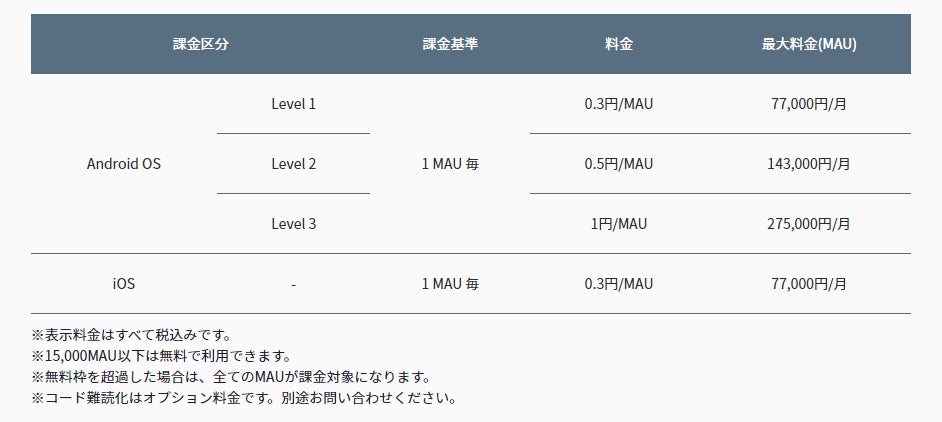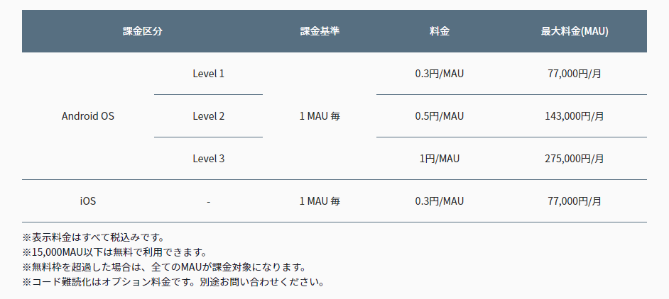料金はMAUごとに0.3円のご提供ですが、1.5万MAU以下は無料でのご提供となり、小規模アプリやトライアルで安心してご利用いただけます。