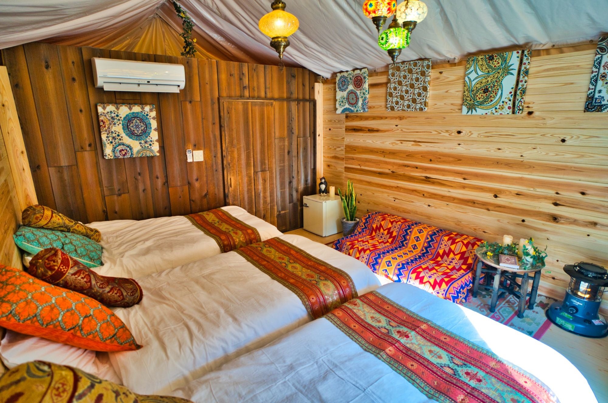 テントをサイズアップし、シングルベッド3台とダブルサイズのソファベッドを設置。