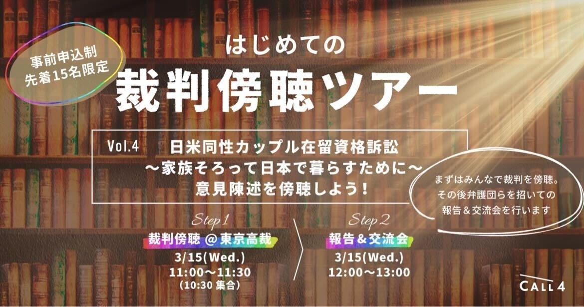 日本初(※1)の公共訴訟支援に特化したウェブプラットフォームCALL4(コールフォー)(運営:特定非営利活動法人CALL4、代表理事:谷口太規)は、2023年3月15日に東京高等裁判所で行われる「日米同性カップル在留資格訴訟〜家族そろって日本で暮らすために〜」の控訴審第一回期日を、CALL4メンバーと傍聴する法廷傍聴ツアーの参加募集を2月24日より開始いたします。