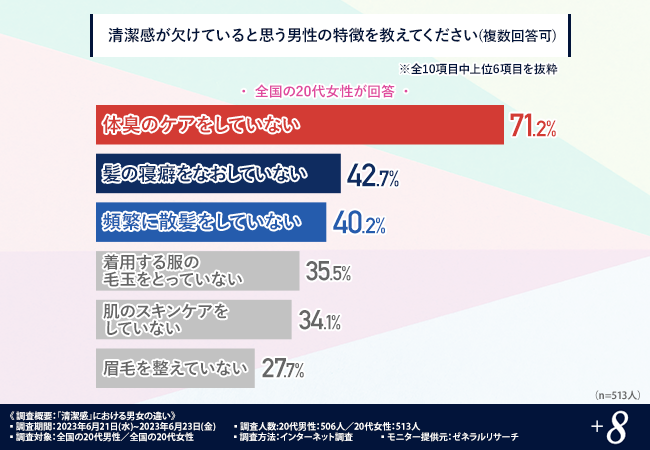 「清潔感が欠けていると思う男性の特徴を教えてください(複数回答可)」と質問したところ、『体臭のケアをしていない(71.2%)』と回答した方が最も多く、次いで『髪の寝癖をなおしていない(42.7%)』『頻繁に散髪をしていない(40.2%)』『着用する服の毛玉をとっていない(35.5%)』『肌のスキンケアをしていない(34.1%)』『眉毛を整えていない(27.7%)』と続きました。