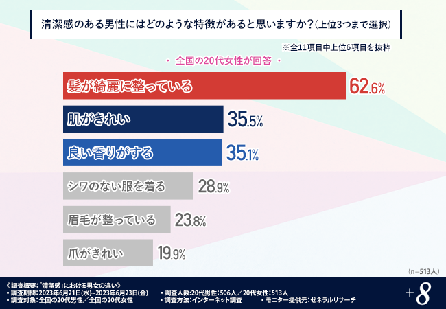 「清潔感のある男性にはどのような特徴があると思いますか?(上位3つまで選択)」と質問したところ、『髪が綺麗に整っている(62.6%)』と回答した方が最も多く、次いで『肌がきれい(35.5%)』『良い香りがする(35.1%)』『シワのない服を着る(28.9%)』『眉毛が整っている(23.8%)』と続きました。