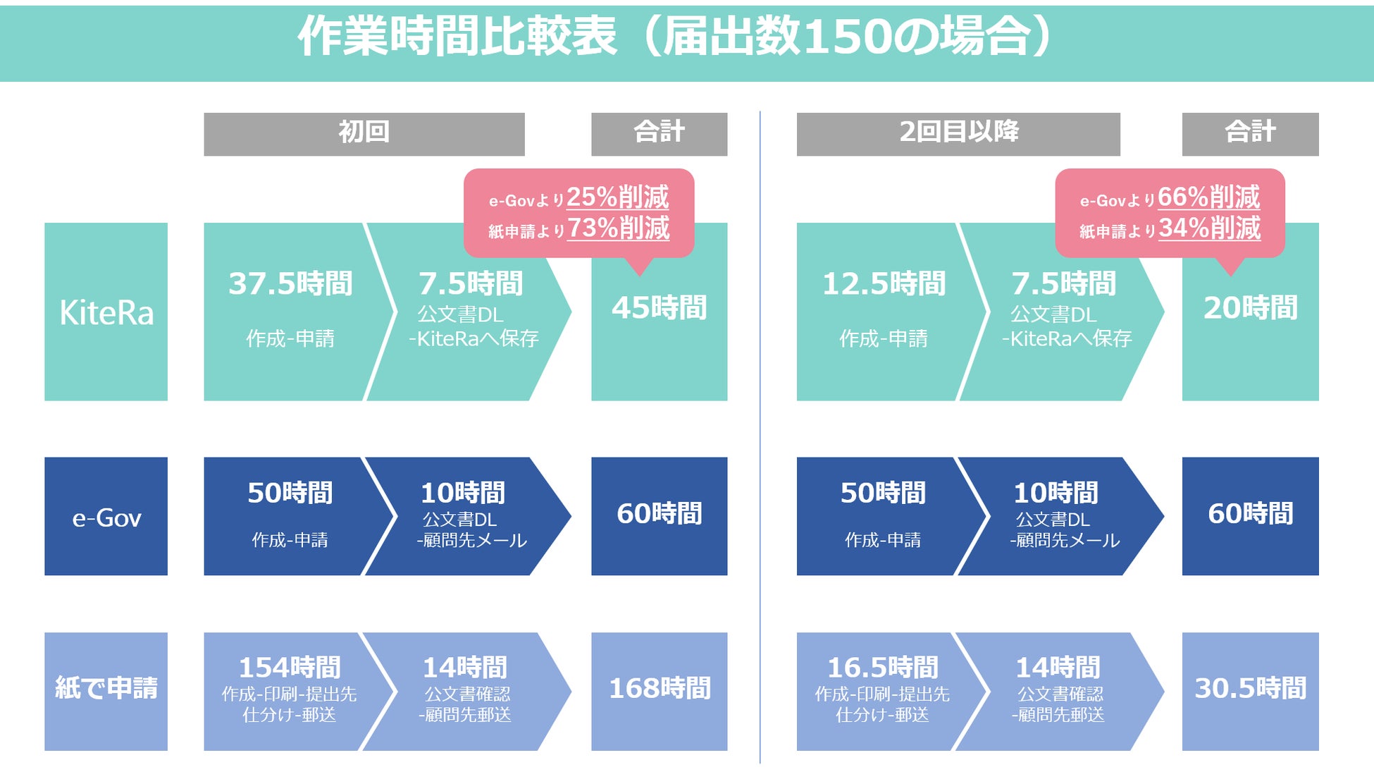 36協定届の申請をKiteRa-Pro-上で行った場合とe-Govで行った場合、従来通り紙で行った場合でそれぞれ比較すると、作業時間は初回ではKiteRa-Pro-はe-Govを使った申請の75%、紙での申請の27%となります。2回目以降についてもe-Govを使った申請の34%、紙での申請の66%となります。