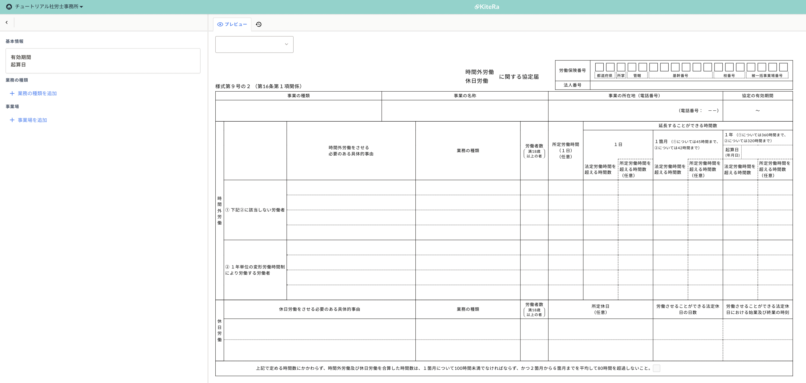 1.36協定届の作成、届出、顧問先への共有まで全てKiteRa-Pro-上で一元管理が可能。