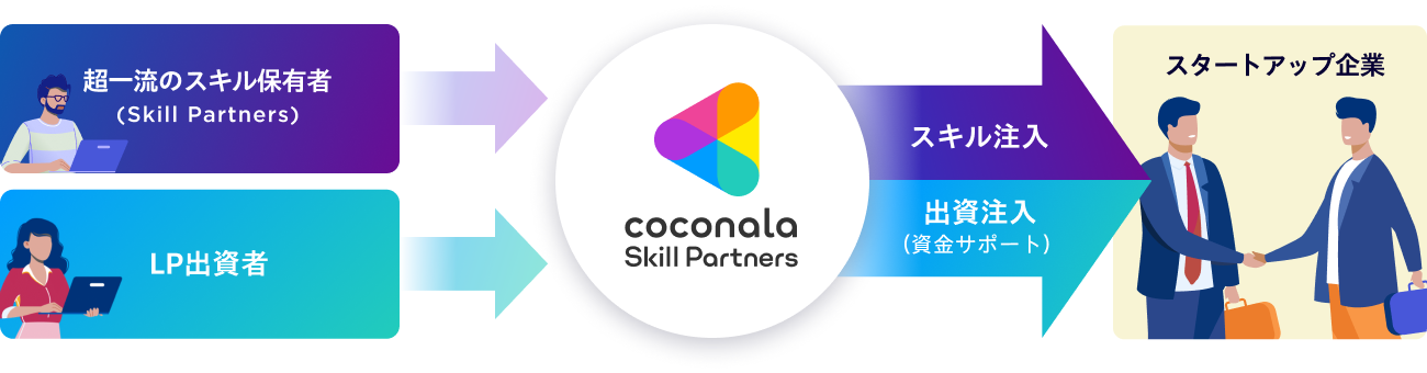 そこでCSPは、ベンチャーキャピタルのエクイティ投資によるリターンを活用して、ココナラが創り上げてきた「スキルを持った人材」と「誰かの助けを必要としている人や企業」をつなぐスキルマッチングというコンセプトを、「極めて高度な専門スキルをもった人材」と「専門スキル不足に直面するスタートアップ企業」のマッチングへ適用します。