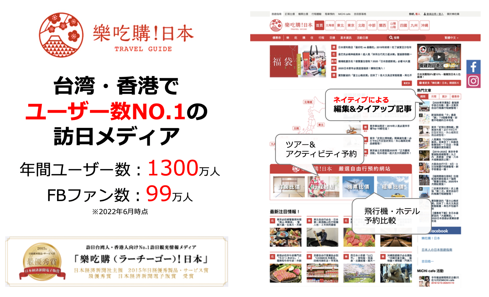 そこで、台湾・香港人向け最大の日本情報サイト『楽吃購(ラーチーゴー)!日本』を運営する株式会社ジーリーメディアグループ(本社:東京都渋谷区 支社:台湾台北市、代表取締役社長 吉田 皓一)が、観光事業者が今からゼロリスクで取り組める集客プロモーションの提供を開始しました。