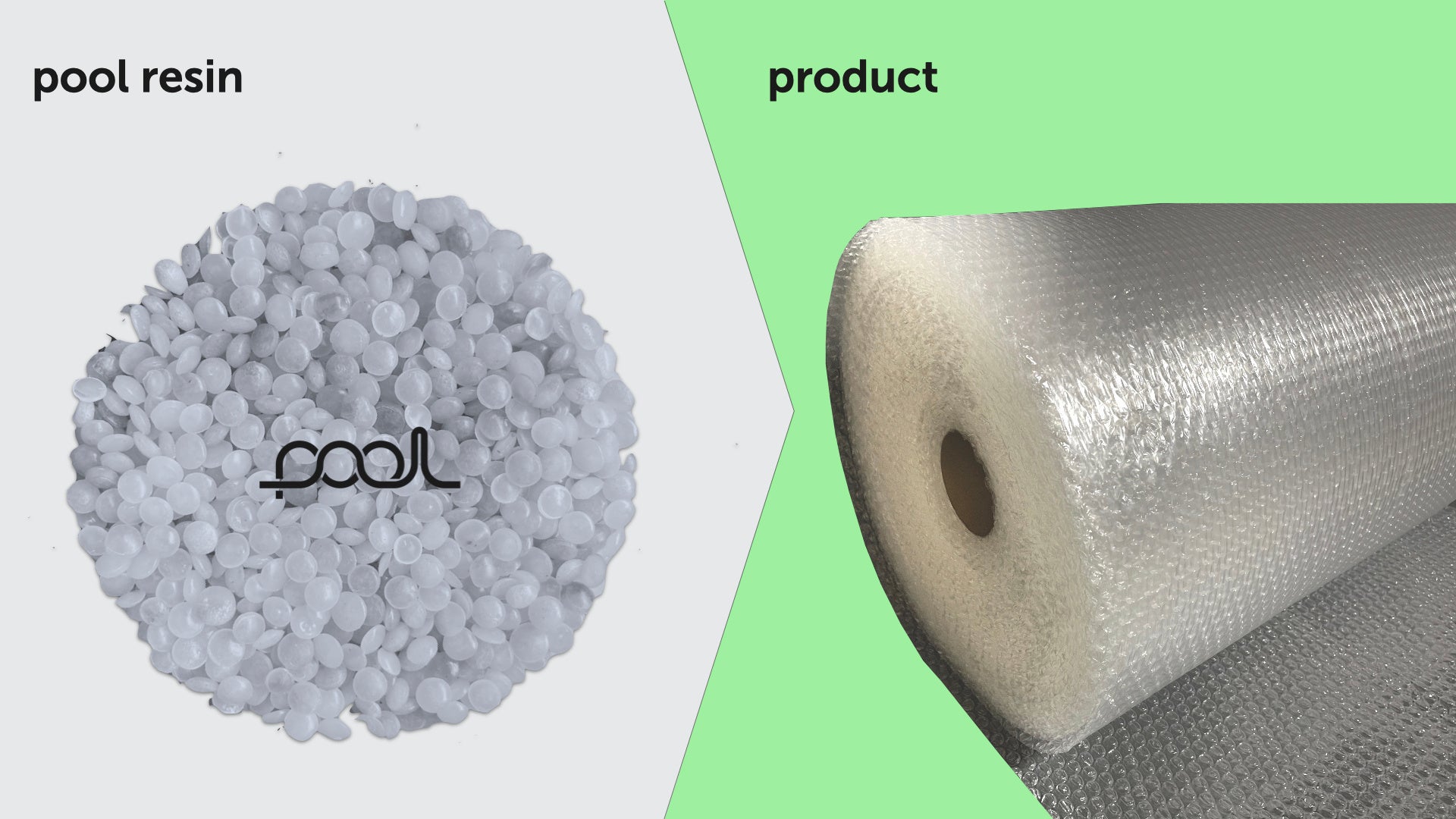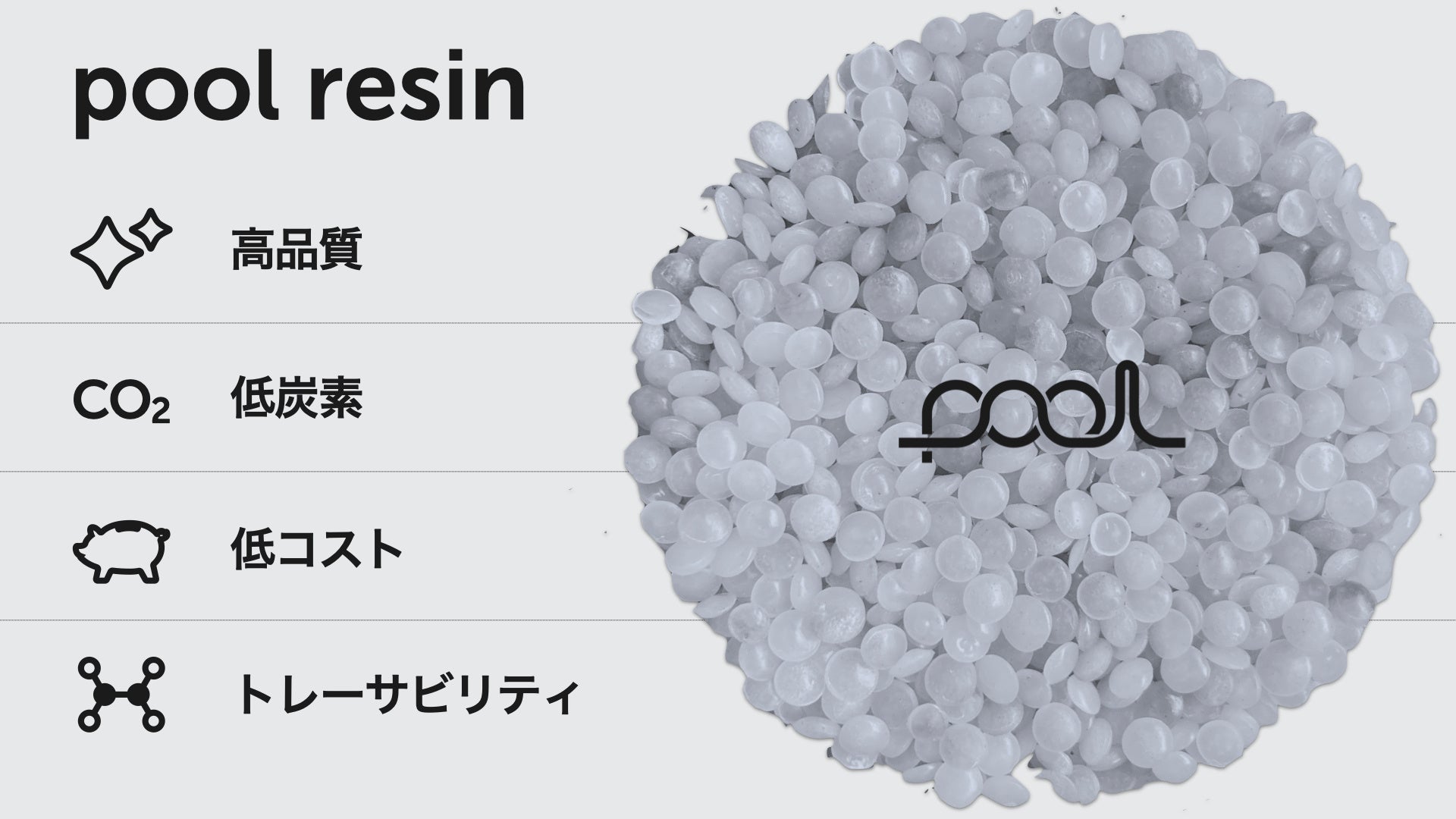 pool resinは、国内の商業施設から回収した廃プラスチックを再生させた国産100%のPCR材です。原料を厳選し、poolで管理することによってトレーサビリティの取れた高品質なPCR材の提供を可能にします。