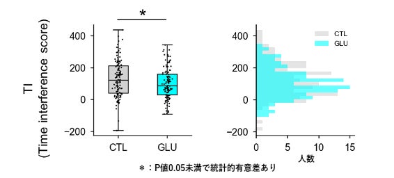 SCWTの成績を評価する指標として、時間干渉指数(TI:課題CWの反応時間 – (課題Wの反応時間 + 課題Cの反応時間)/2)及びエラー率、正解総数を用いました。その結果、ぶどう糖摂取群はコントロール群に比べ、時間干渉指数TI及び課題Cのエラー率が有意に小さいことが分かりました(図1)。一方で、課題Wと課題CWのエラー率、三つの課題の正解総数には有意な差が認められませんでした。