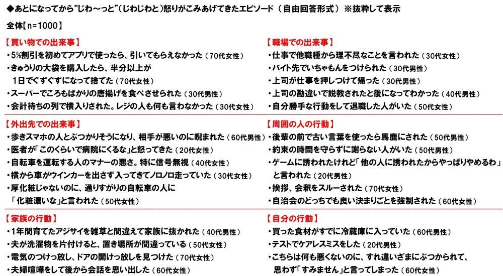 全回答者(1,000名)に、あとになってから“じわ~っと”(じわじわと)怒りがこみあげてきたエピソードを聞いたところ、買い物での出来事に関することでは「5%割引を初めてアプリで使ったら、引いてもらえなかった(70代女性)」や「会計待ちの列で横入りされた。レジの人も何も言わなかった(30代女性)」、職場での出来事に関することでは「バイト先でいちゃもんをつけられた(30代男性)」や「上司が仕事を押しつけて帰った(30代男性)」、外出先での出来事に関することでは「医者が『このくらいで病院にくるな』と怒ってきた(20代女性)」や「横から車がウインカーを出さず入ってきてノロノロ走っていた(30代女性)」、周囲の人の行動に関することでは「後輩の前で古い言葉を使ったら馬鹿にされた(50代男性)」や「挨拶、会釈をスルーされた(70代女性)」、家族の行動に関することでは「夫が洗濯物を片付けると、置き場所が間違っている(50代女性)」や「夫婦喧嘩をして後から会話を思い出した(60代女性)」といった回答が挙げられました。理不尽な経験をしたり、マナー違反の行為を目にしたりした記憶がよみがえり、苛立ちを覚える人が多いのではないでしょうか。