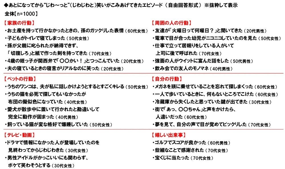全回答者(1,000名)に、あとになってから“じわ~っと”(じわじわと)笑いがこみあげてきたエピソードを聞いたところ、家族の行動に関することでは「お土産を持って行かなかったときの、孫のガックリした表情(60代女性)」や「子どもがトイレで寝てしまった(50代女性)」、周囲の人の行動に関することでは「友達が『火曜日って何曜日?』と聞いてきた(20代男性)」や「仕事で立って居眠りをしている人がいて上司に後で呼ばれた(70代女性)」、ペットの行動に関することでは「うちのワンコは、夫が私に話しかけようとするとすごくキレる(50代女性)」や「飼っている猫が変な格好で爆睡していた(50代女性)」、自分の行動に関することでは「メガネを頭に乗せていることを忘れて探しまくった(60代女性)」や「一人で歩いているときに、何もないところでこけた(60代女性)」といった回答が挙げられました。他人の面白い行動や自分のちょっとした失敗を思い出すと、愉快な気持ちになってしまうのではないでしょうか。