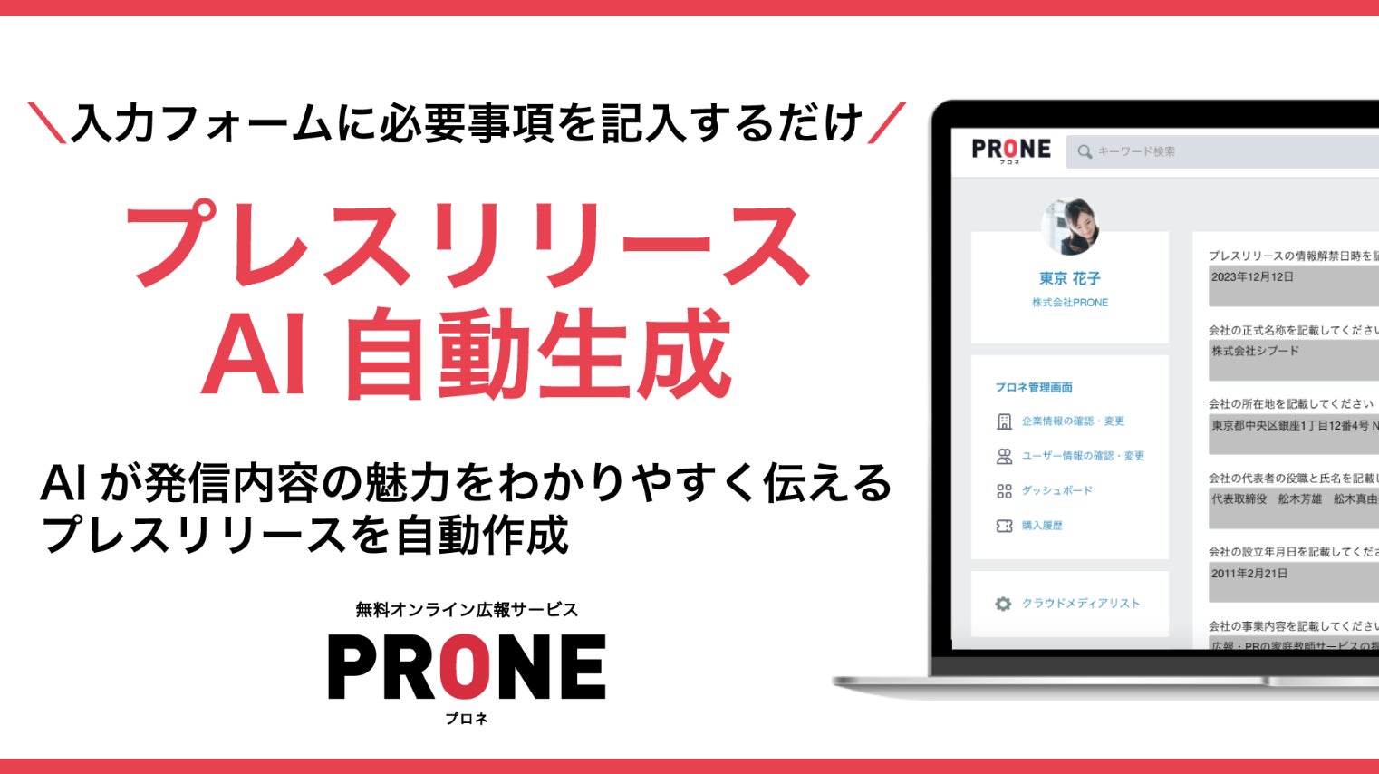 ・内容: AIを活用しプレスリリースを自動で作成する業界初の新サービスで、オンライン広報サービスPRONE(プロネ)に搭載。