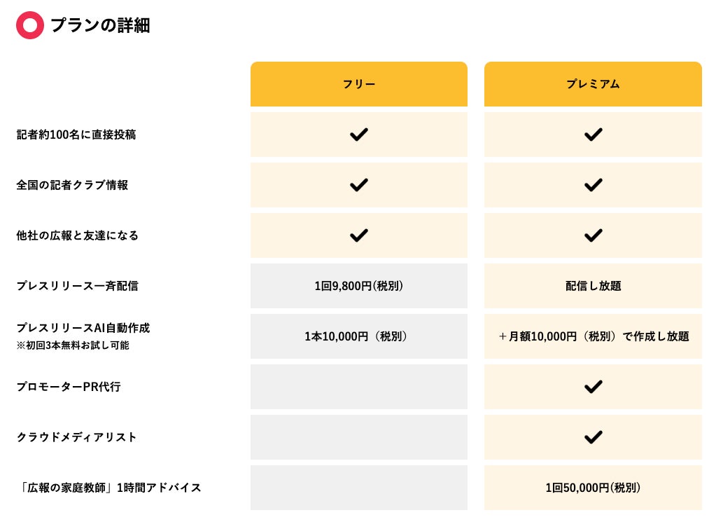 ・無料のフリー会員は、大手メディア所属のキーマンとなる記者100名に、プレスリリースをはじめとした自社のニュースを無料で何度でも情報提供が可能