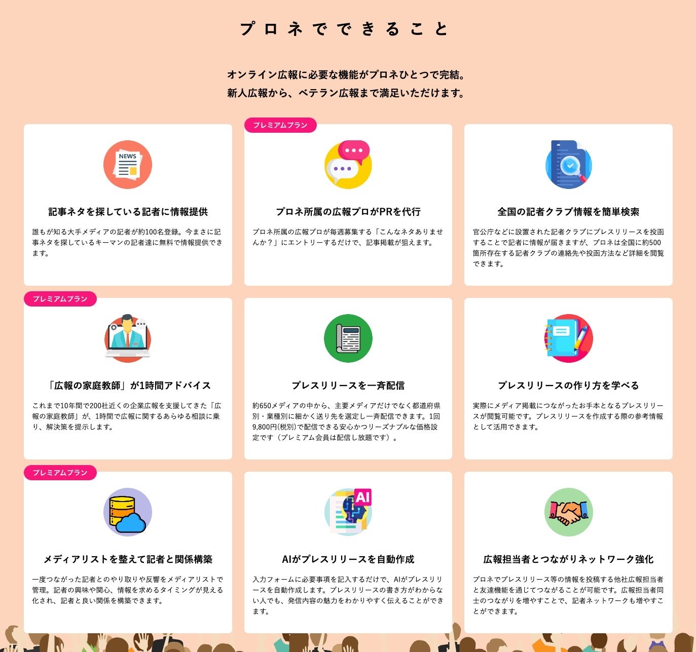 プロネは、オンライン上でキーマン記者100名にリリース配信ができ、また全国の記者クラブやリリース好例が探せる無料のフリープランと、最大300媒体へリリース配信し放題や毎週の募集ネタへの応募から、メディアリストのクラウド管理(広報CRM)、広報セミナー受講、広報専門家への相談(オプション)まで、オンライン広報に必要なフル機能が使える月額1万円(税別)のプレミアムプラン(※2)があります。