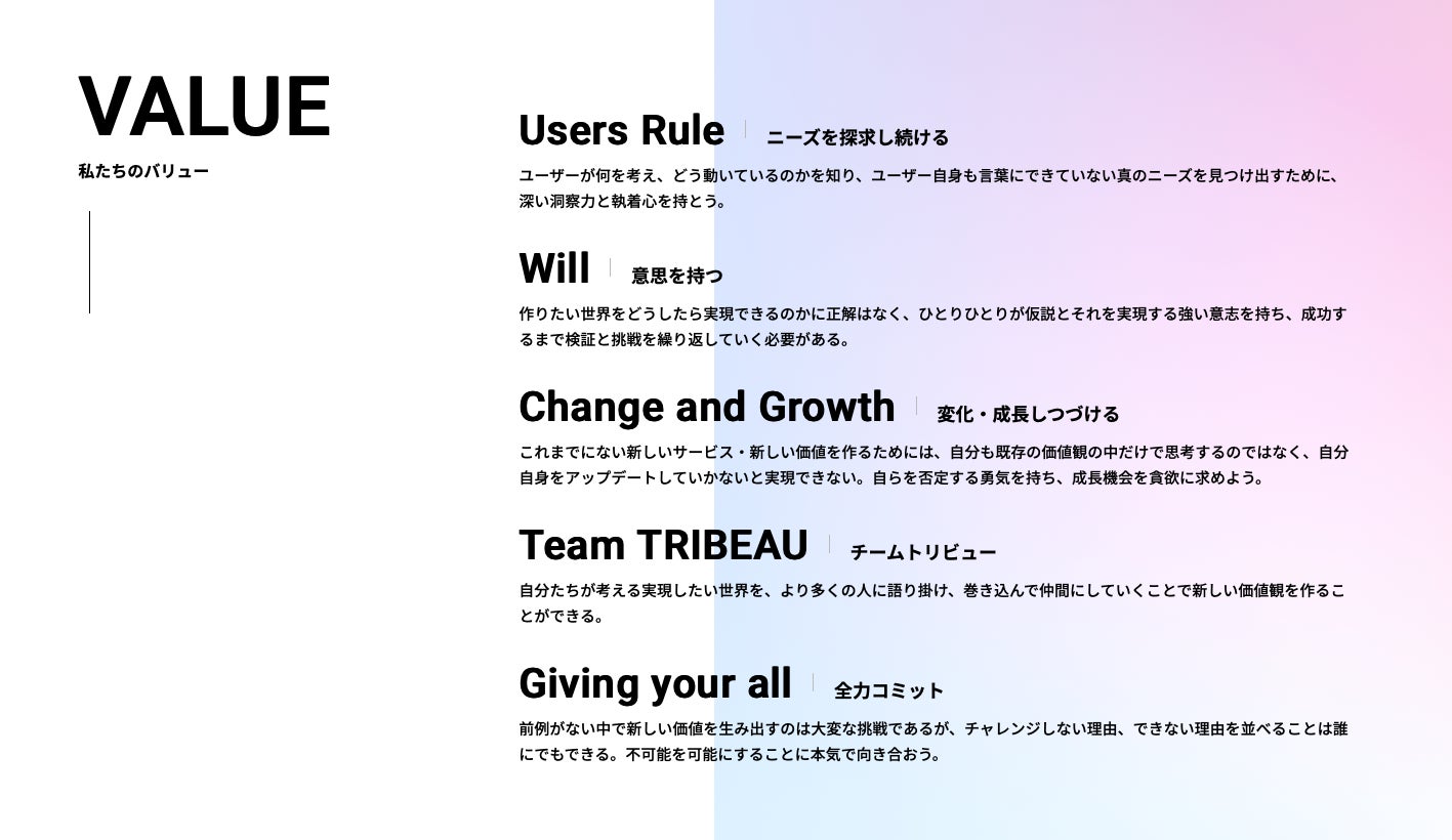 トリビューがユーザーの皆さまにとってどのような存在であり続けたいのかに加えて、トリビューが成長を続けるために守っていきたい価値観を言語化しています。