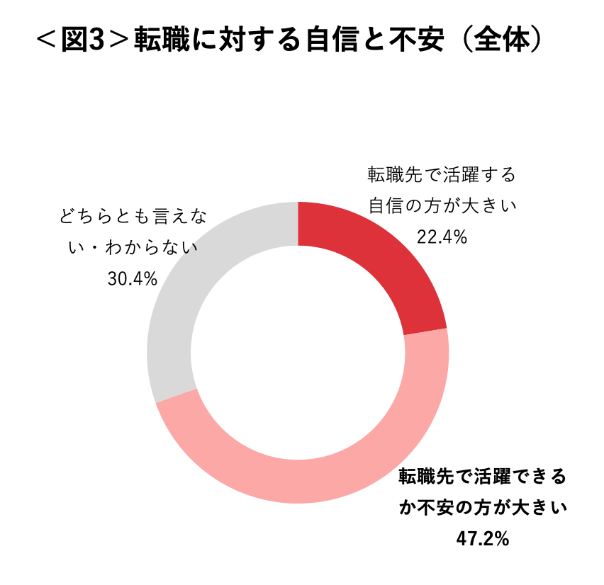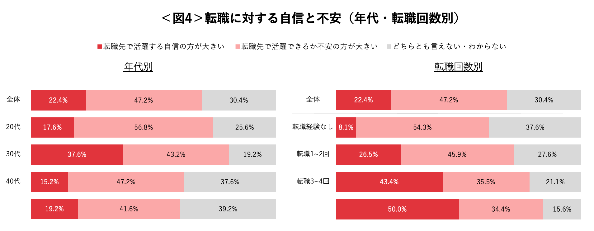 年代・転職回数別に見ると、特に20代や転職経験なしの層は転職先で活躍できるか不安を抱える割合が半数を超える。<図4>