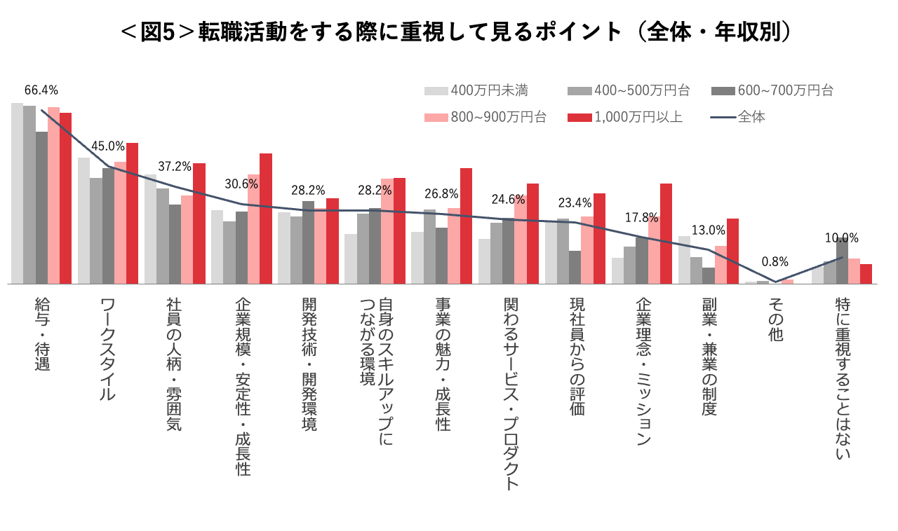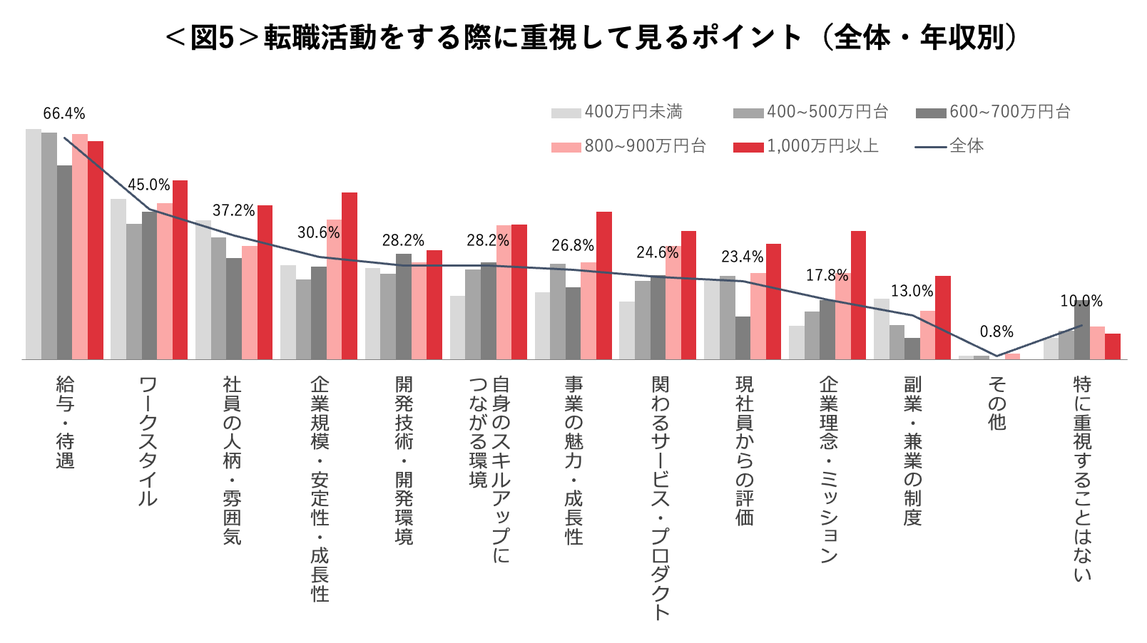 年収別に見ると、年収1,000万円以上の層は重視して見るポイントも多く、他年代と比べると「企業規模・安定性・成長性」や「事業の魅力・成長性」「企業理念・ミッション」などの項目に関して、重視している割合が高い傾向。<図5>