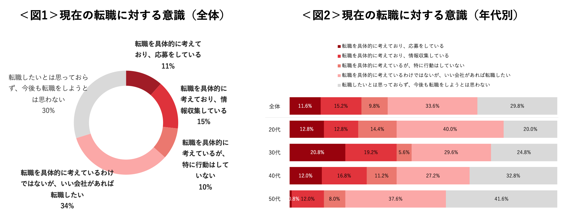 年代別に見ると20代は「転職を具体的に考えているわけではないが、いい会社があれば転職したい」と回答した人が4割を占め「転職をしたいとは思っておらず、今後も転職をしようと思わない」と回答した割合が各年代の中で最も低い。このことから、20代は転職フェーズであるなしに関わらず、他世代に比べ転職のハードルが低い様子が伺える。<図2>