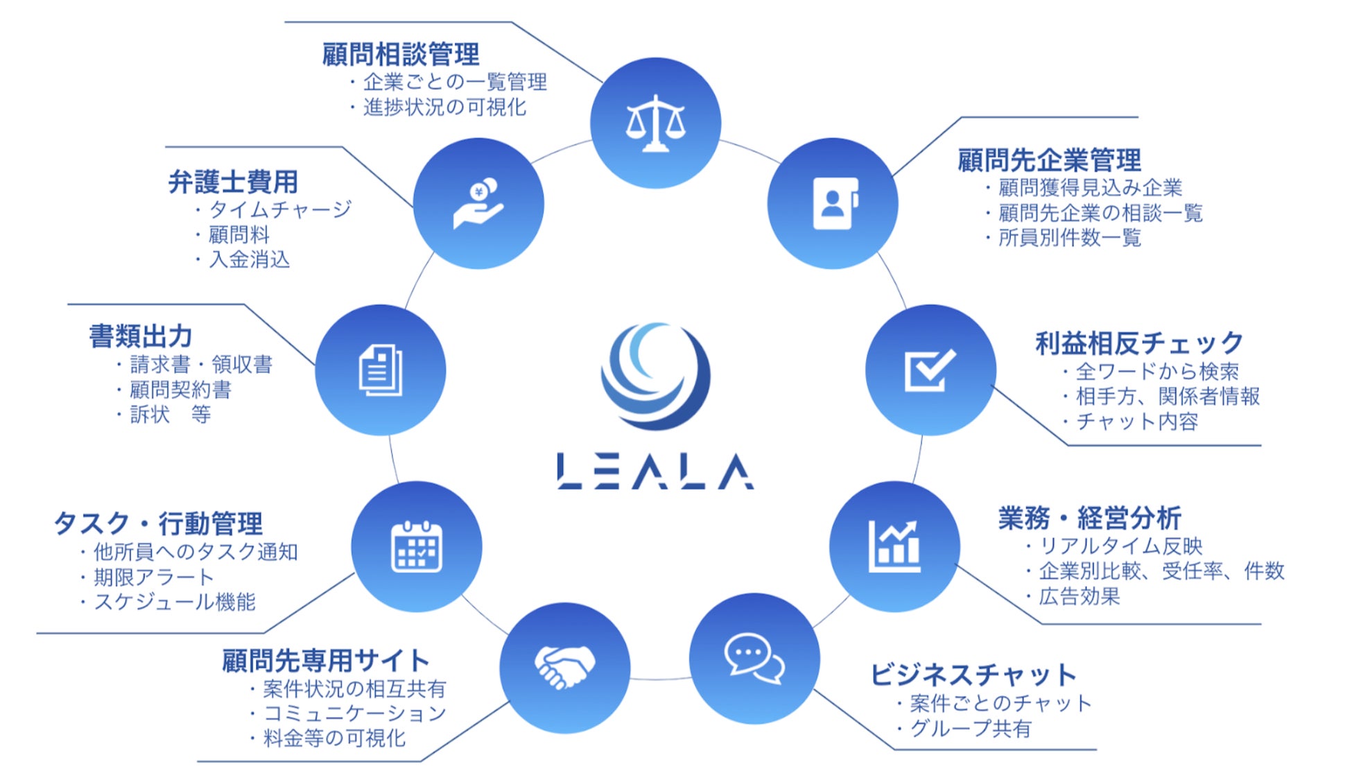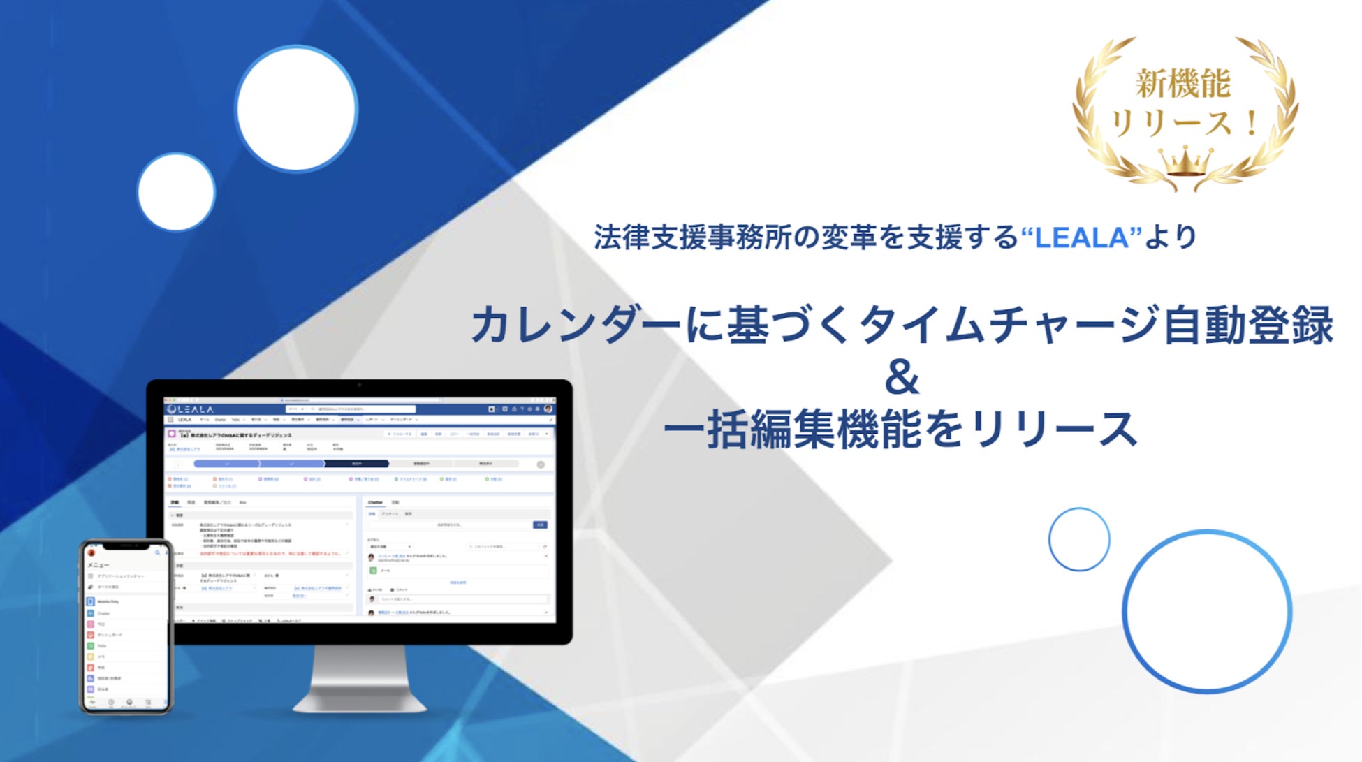 2019年創業以降、弁護士・法律事務所向けに特化して開発・提供してきたクラウド業務管理システム「LEALA」が、今般の新機能の追加により、企業法務系法律事務所の顧客/案件管理、ファイル管理、タイムチャージ登録、請求書作成等の業務フローを全て一元化し、効率的なオペレーションを実現できるようになりました。
