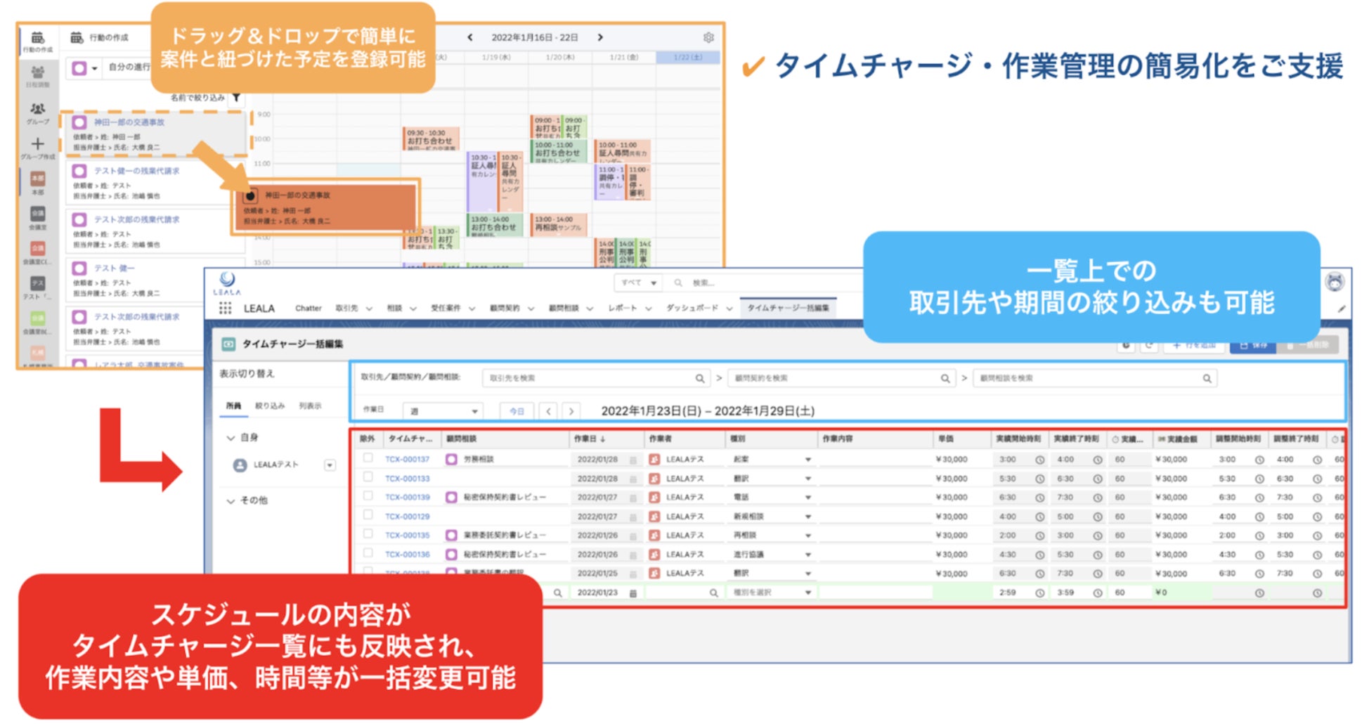 LEALAのカレンダーでは、ドラッグ&ドロップで簡単に案件と紐づけた予定の登録が可能です。カレンダーでの予定の作成時もしくは編集時に「タイムチャージに連携」を選択することで、スケジュールの内容が自動的にタイムチャージ一覧にも反映されます。